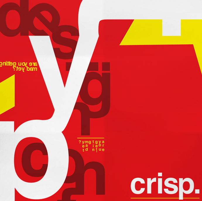 The colours used were chosen because of their ‘sharpness’, reflecting the name of the conference, Crisp. The overall style of my work came from many areas, particularly Swiss Design. I felt this style not only looked good as an overall theme, but also reflected aspects of my speakers work. I also integrated their work in a playful and interesting way.